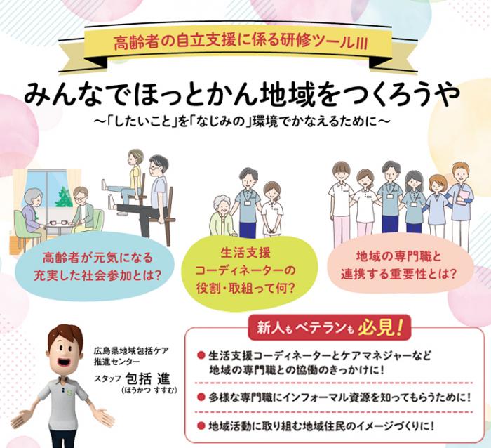 生活支援コーディネーターの活動や多様な専門職等との連携事例をまとめた「高齢者の自立支援に係る研修ツールⅢ」DVDを制作しました。ご活用ください。